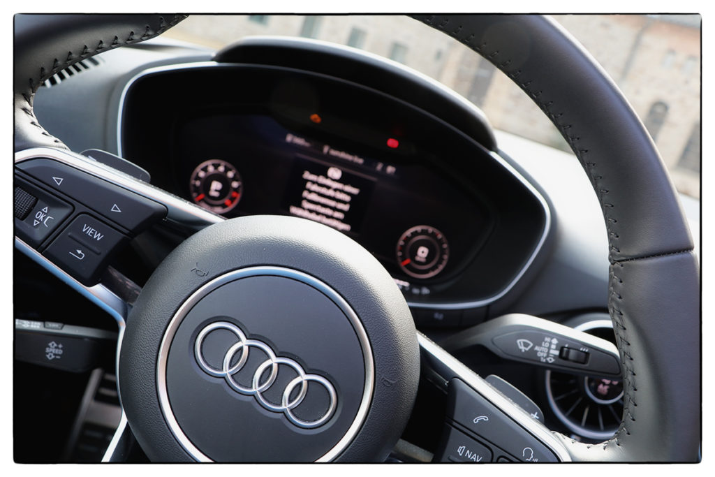 Solidität ist aber auch der zweite Vorname Audis. Der Innenraum wirkt so fein und edel, dabei aber gleichzeitig so unverwüstlich, dass man hier sogar mit einer Abrissbirne keinen Schaden anrichten könnte. Ok, versucht haben wir es nicht, aber die Metapher spricht wohl für sich. Spannend ist hier vor allem die Gestaltung. Ein großer Navi-Bildschirm im der Mittelkonsole? Fehlanzeige! Doch auf ein Infotainment oder einen hilfreichen Wegweiser – geschweige denn auf Musik – muss dennoch niemand verzichten. Der Schlüssel ist hier das Mäusekino à la „Audi Virtual Cockpit“. Hier lassen sich alle wichtigen Informationen direkt dort einblenden, wo sie benötigt werden: Vor der Nase des Fahrers. Das unterstreicht zum einen den praktischen Anspruch Audis, zeigt zum anderen aber auch, dass der Audi TT Roadster ein echtes Fahrerauto sein will.