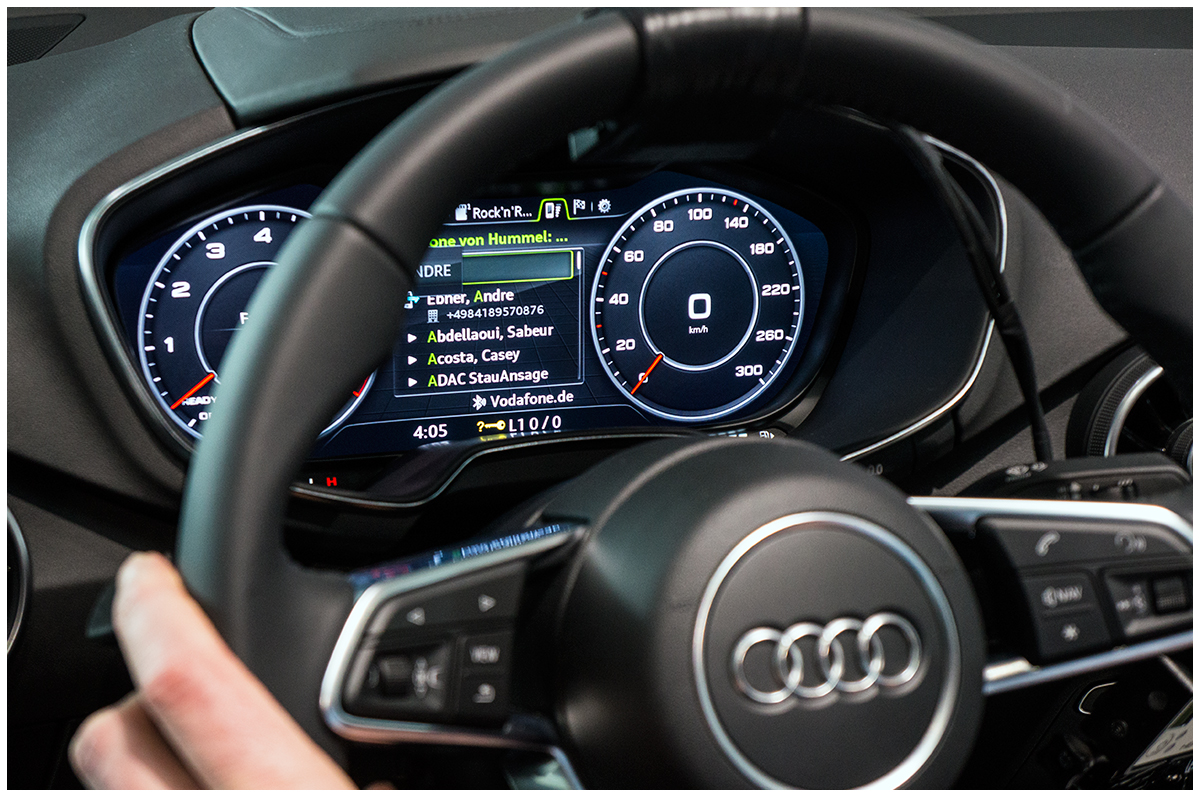 Im Innenraum kommt der neue TT mit einer wahren Überraschung daher. Das neue Virtual Cockpit ist wirklich eine schicke Idee. Das Infotainment-System ersetzt die klassischen Instrumente. Alles wird im TT digital angezeigt. Das 12,3 Zoll große Display mit brillanter Auflösung kann wahlweise zwei Anzeigemodi anzeigen. Neben der klassischen Ansicht mit Tachometer und Drehzahlmesser als bekannte Rundinstrumente kann der Audi TT Fahrer die Displayfläche auch vorzugsweise für die Anzeige der Radio-Einstellung oder Navigationskarte nutzen. Die Tachometer- und Drehzahlmesser-Instrumente werden dann kleiner dargestellt.