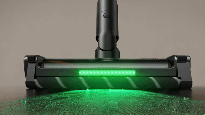 Ein weiteres cleveres Feature ist die integrierte Beleuchtung an der Bodendüse. Ein LED-Lichtband an der Vorderseite strahlt den Boden in einem breiten Winkel an und macht Staub in dunklen Ecken oder unter Möbeln sichtbar. Das leicht grünliche Licht (ähnlich wie man es von manchen Saugrobotern kennt) hebt feine Staubpartikel kontrastreich hervor – und tatsächlich entdeckt man damit Schmutz, den man bei normalem Zimmerlicht übersehen würde. Gerade unter dem Bett oder Sofa war ich überrascht, was dort noch alles lag, obwohl es auf den ersten Blick sauber schien. Mit Licht sieht man einfach besser, wo noch gesaugt werden muss, und kann kein Staubkorn mehr als Ausrede übersehen.
