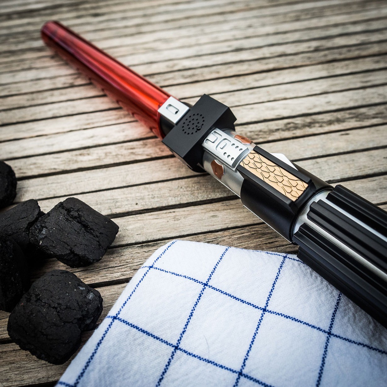 Da ein Laserschwert die Wurst wohl eher problemlos in mehrere Kleinteile zerstückeln würde anstatt sie auf dem Grill zu wenden, sollte man dann doch eher auf die Star Wars Grillzange mit Laserschwert Sound zurückgreifen. Sie sieht optisch aus wie ein Laserschwert, hat aber vorne eine praktische Grillzange integriert. Bei Nichtgebrach kann man sie ganz einfach in eine rote Plastikhülle verpacken, sodass die Optik dann noch mehr einem echten Laserschwert gleicht. Der Griff jedenfalls, ist ob in der Verpackung oder auch nicht, im Laserschwerststil gestaltet.