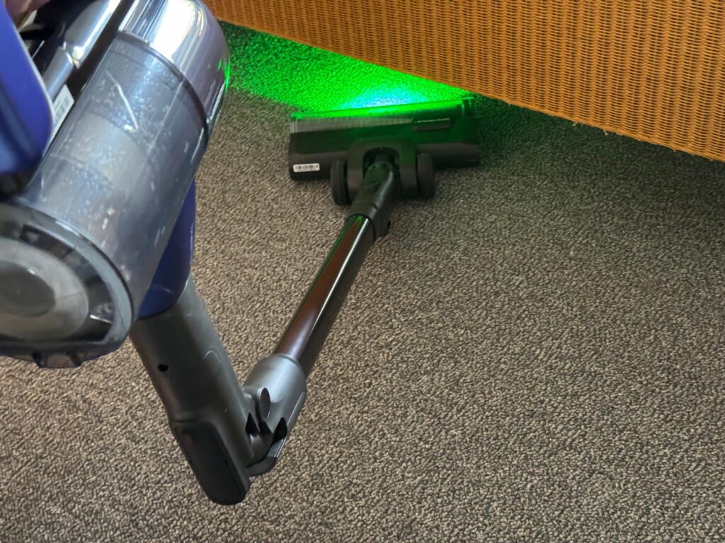 Unter Möbeln & enge Stellen: Das faltbare Saugrohr ist ein Alleinstellungsmerkmal, das in der Praxis wirklich hilft. Mit einem Druck auf den Entriegelungsknopf am Rohr knickt man das Rohr in etwa der Mitte um bis zu 180° ab. Dadurch „kniet“ der Stabstaubsauger gewissermaßen flach nach vorne unten, und man kann weit unter Betten, Sofas oder Schränke gelangen, ohne selber in die Knie zu gehen. Wer kennt es nicht: Wollmäuse sammeln sich gerne unter dem Sofa, und normal muss man sich bücken oder mit einer flachen Düse hantieren. Hier schiebt man einfach den S50 Pro flach rein – das Gelenk hält die Bodendüse am Boden, während das Handteil in der Hand aufrecht bleiben kann. Die grünen LED-Frontlichter an der Düse leisten genau in solchen dunklen Ecken großartige Arbeit: Das breite 120°-Leuchtfeld in Grün hebt selbst feinen Staub deutlich vom Boden ab, sodass man keinen Krümel übersieht. Warum gerade Grün? Weil diese Lichtfarbe kleinste Partikel auf hellen und dunklen Böden kontrastreicher sichtbar macht – Staubkörner „leuchten“ quasi unter dem grünen Licht, was mit bloßem Auge unter normalem Licht schwer erkennbar wäre. Es ist tatsächlich erstaunlich, wie viel versteckter Dreck plötzlich ins Auge springt, wenn die grünen LEDs darüber strahlen. Das motiviert beinahe, noch gründlicher zu saugen, weil man den Erfolg direkt sieht.