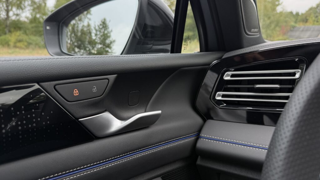 An Ablagen und Anschlüssen mangelt es im Tiguan ebenfalls nicht. In der Mittelkonsole vorn gibt es ein großes Fach mit induktiver Ladeschale fürs Smartphone (sogar zwei Handys passen nebeneinander) plus zwei USB-C-Ports (insgesamt sind im Fahrzeug bis zu 4 USB-C Anschlüsse verbaut, zwei vorne, zwei hinten). Die vorderen USB-C Buchsen sind beleuchtet und bieten die Schnellladefunktion mit höherer Leistung – praktisch, wenn das Handy fix Energie braucht. In den Türen finden sich große Fächer für 1,5-Liter-Flaschen und Kleinkram. Das Handschuhfach ist ordentlich dimensioniert, und unter der Mittelarmlehne wartet ein weiteres Staufach. Dadurch, dass der Gangwahlhebel nun als kleiner Hebel rechts an der Lenksäule sitzt (eine Neuerung im Tiguan: der Wählhebel wandert nach oben, ähnlich wie bei Mercedes, wodurch Platz in der Mittelkonsole frei wird), hat man im Zentrum jetzt viel Freiraum. Volkswagen hat diesen mit zusätzlichen Cupholdern und eben besagtem Ablagefach samt Ladestation gefüllt. Auch hinten gibt es in der Mittelkonsole zwei Lüftungsdüsen und – in unserer Testwagen-Konfiguration – eine kleine Klima-Bedieneinheit für die hintere Zone. Ja, der Tiguan kann optional 3-Zonen-Klimaautomatik, sodass Fondpassagiere ihre eigene Temperatur regeln dürfen. Kleinigkeiten wie ausklappbare Haken an den B-Säulen (für Jacken) und ausfahrbare Sonnenblenden an den hinteren Türen (im Winterpaket enthalten) runden das familienfreundliche Bild ab.