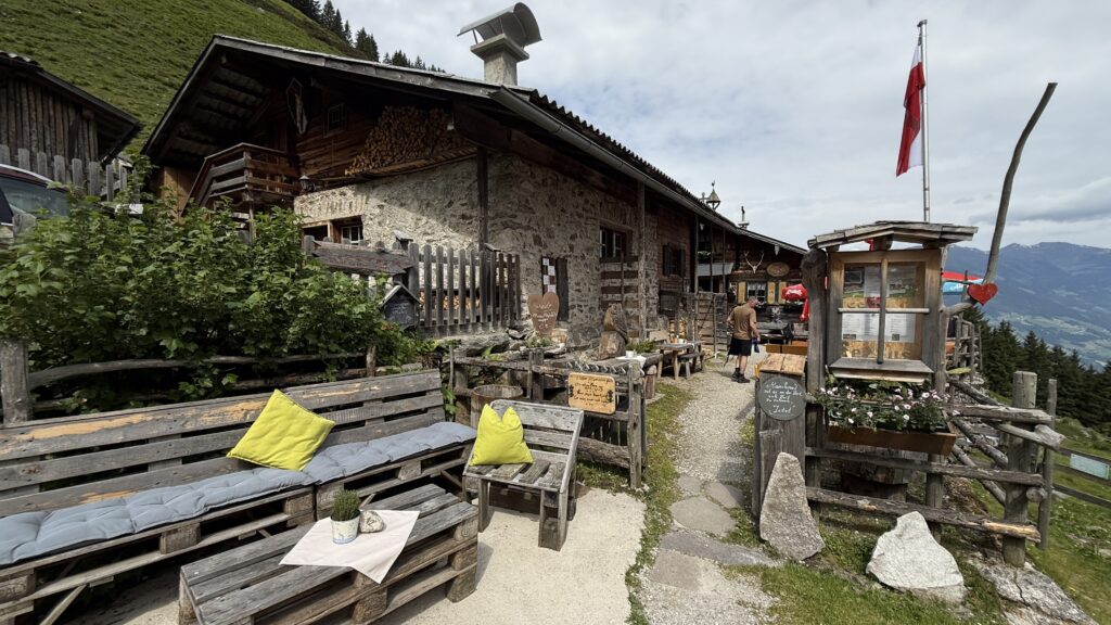 - Bichlalm (Hintertux) – Sonnenterrasse mit Panorama, bekannt für traditionelle Tiroler Küche. Wir haben hier den besten Apfelstrudel der Reise gegessen. Auch die Speck-Jausenplatte, die wir am Nachbartisch sahen, sah fantastisch aus: Bergkäse, Hirschsalami, Bauernbrot – alles lokal. Ein Ort, an dem man leicht länger sitzt als geplant.